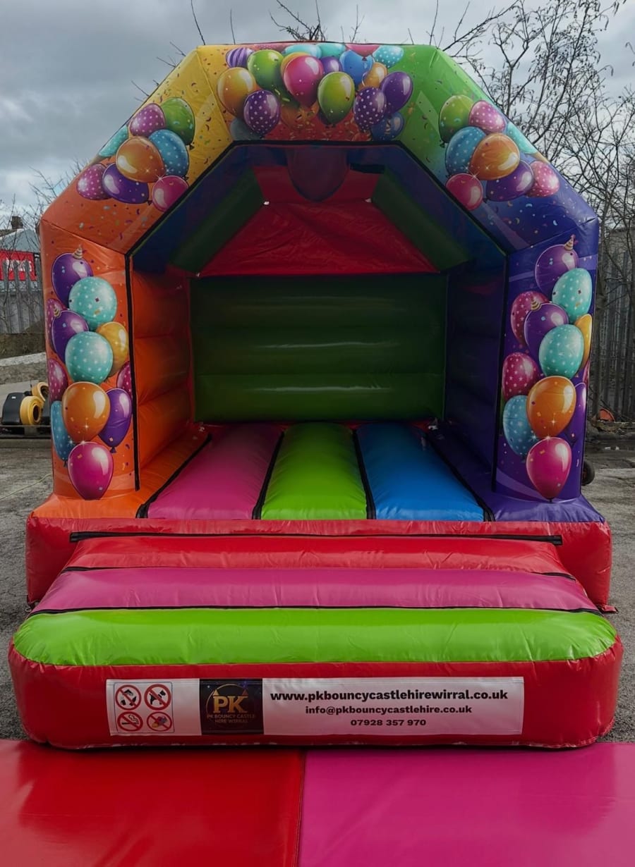 PK Bouncy Castle Hire Wirral 10 ft x 12 ft Multicoloured Party Time Bouncy Castle in Barnston Bebington Beechwood Bidston Birkenhead Brimstage Bromborough Caldy Clatterbridge Claughton Eastham Egremont Ford Frankby Gayton Grange Greasby Heswall Hoylake Irby Landican Larton Leasowe Liscard Meols Moreton New Brighton New Ferry Newton Noctorum Oxton Pensby Port Sunlight Poulton Prenton Raby Mere Raby Rock Ferry Saughall Massie Seacombe Spital Storeton Thingwall Thornton Hough Thurstaston Tranmere Upton Wallasey Wallasey Village West Kirby Woodchurch Woodside. Compact size. Big smiles. Ideal for kids’ parties, school fun days and small community events. 👧🧒