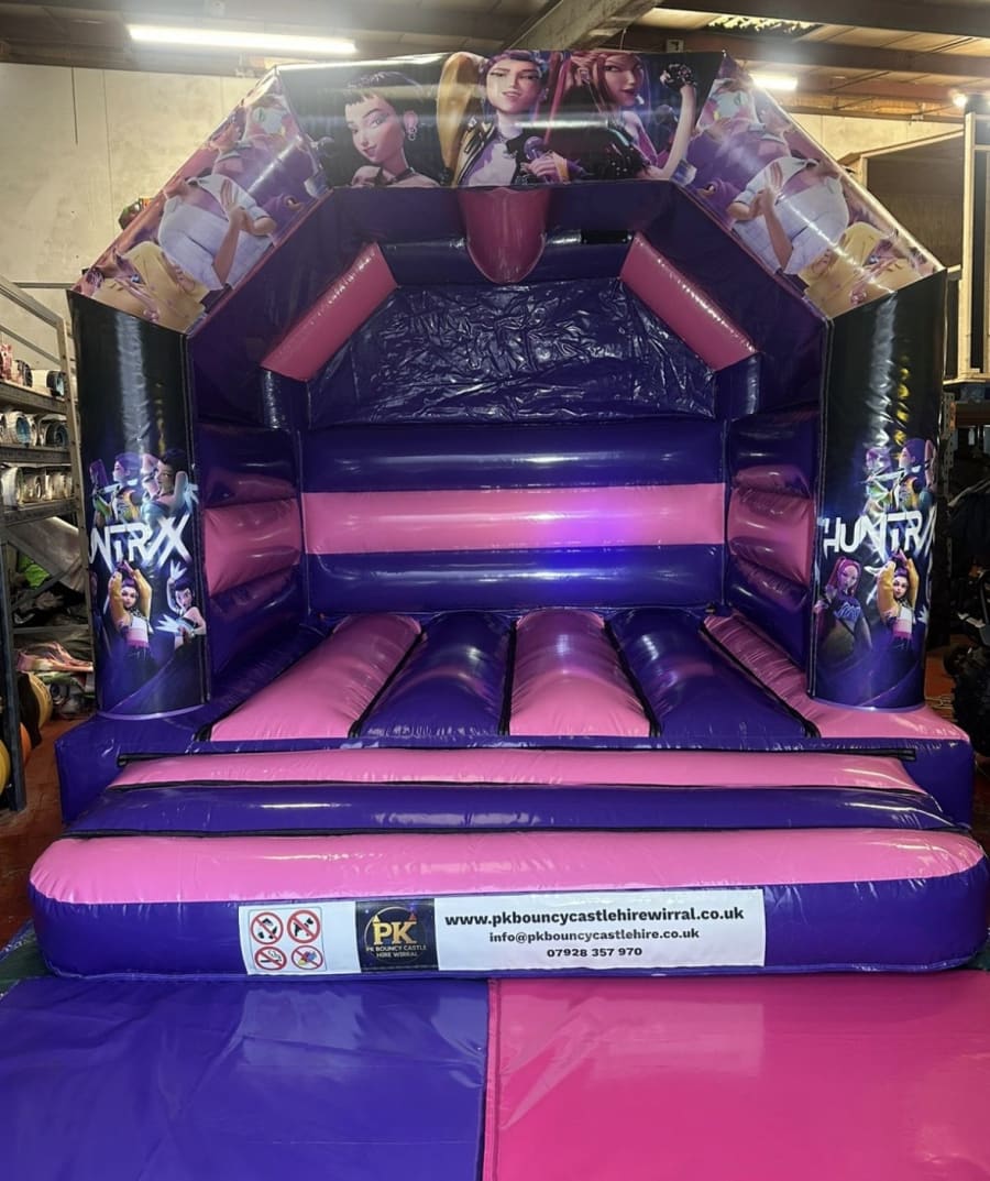 PK Bouncy Castle Hire Wirral 12 ft x 12 ft Pink & Purple K-Pop Bouncy Castle in Barnston Bebington Beechwood Bidston Birkenhead Brimstage Bromborough Caldy Clatterbridge Claughton Eastham Egremont Ford Frankby Gayton Grange Greasby Heswall Hoylake Irby Landican Larton Leasowe Liscard Meols Moreton New Brighton New Ferry Newton Noctorum Oxton Pensby Port Sunlight Poulton Prenton Raby Mere Raby Rock Ferry Saughall Massie Seacombe Spital Storeton Thingwall Thornton Hough Thurstaston Tranmere Upton Wallasey Wallasey Village West Kirby Woodchurch Woodside