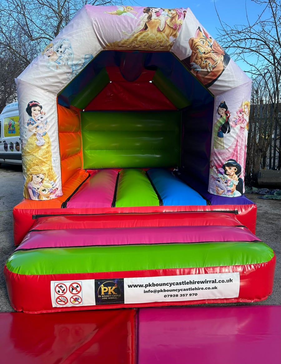 PK Bouncy Castle Hire Wirral 10 ft x 12 ft Multicoloured Disney Princess Bouncy Castle in Barnston Bebington Beechwood Bidston Birkenhead Brimstage Bromborough Caldy Clatterbridge Claughton Eastham Egremont Ford Frankby Gayton Grange Greasby Heswall Hoylake Irby Landican Larton Leasowe Liscard Meols Moreton New Brighton New Ferry Newton Noctorum Oxton Pensby Port Sunlight Poulton Prenton Raby Mere Raby Rock Ferry Saughall Massie Seacombe Spital Storeton Thingwall Thornton Hough Thurstaston Tranmere Upton Wallasey Wallasey Village West Kirby Woodchurch Woodside. Bring fairy-tale fun to your event with bright colours and Disney-themed artwork. π Ideal for kids parties, garden parties, school fun days and summer parties. Book early for weekends and school holidays. β¨